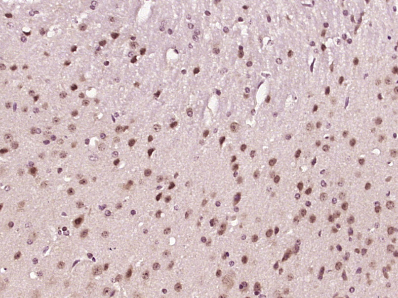 Paraformaldehyde-fixed, paraffin embedded (Mouse brain); Antigen retrieval by boiling in sodium citrate buffer (pH6.0) for 15min; Block endogenous peroxidase by 3% hydrogen peroxide for 20 minutes; Blocking buffer (normal goat serum) at 37°C for 30min; Antibody incubation with (NR5A2) Polyclonal Antibody, Unconjugated (bs-10444R) at 1:400 overnight at 4°C, followed by operating according to SP Kit(Rabbit) (sp-0023) instructionsand DAB staining.