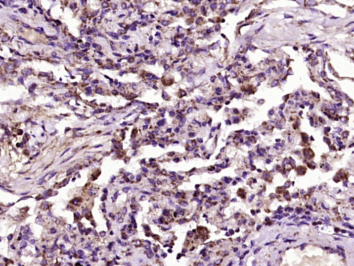 Paraformaldehyde-fixed, paraffin embedded (human lung carcinoma); Antigen retrieval by boiling in sodium citrate buffer (pH6.0) for 15min; Block endogenous peroxidase by 3% hydrogen peroxide for 20 minutes; Blocking buffer (normal goat serum) at 37°C for 30min; Antibody incubation with (FLVCR) Polyclonal Antibody, Unconjugated (bs-12344R) at 1:400 overnight at 4°C, followed by operating according to SP Kit(Rabbit) (sp-0023) instructionsand DAB staining.
