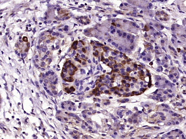 Paraformaldehyde-fixed, paraffin embedded (human Pancreatic cancer ); Antigen retrieval by boiling in sodium citrate buffer (pH6.0) for 15min; Block endogenous peroxidase by 3% hydrogen peroxide for 20 minutes; Blocking buffer (normal goat serum) at 37°C for 30min; Antibody incubation with (FLVCR) Polyclonal Antibody, Unconjugated (bs-12344R) at 1:400 overnight at 4°C, followed by operating according to SP Kit(Rabbit) (sp-0023) instructionsand DAB staining.