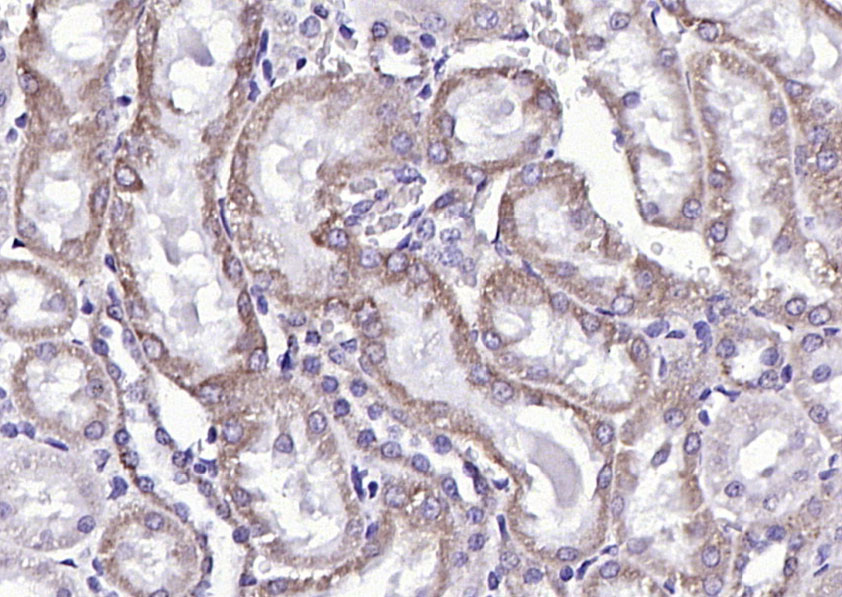 Paraformaldehyde-fixed, paraffin embedded (rat kidney); Antigen retrieval by boiling in sodium citrate buffer (pH6.0) for 15min; Block endogenous peroxidase by 3% hydrogen peroxide for 20 minutes; Blocking buffer (normal goat serum) at 37°C for 30min; Antibody incubation with (FLVCR) Polyclonal Antibody, Unconjugated (bs-12344R) at 1:200 overnight at 4°C, followed by operating according to SP Kit(Rabbit) (sp-0023) instructionsand DAB staining.