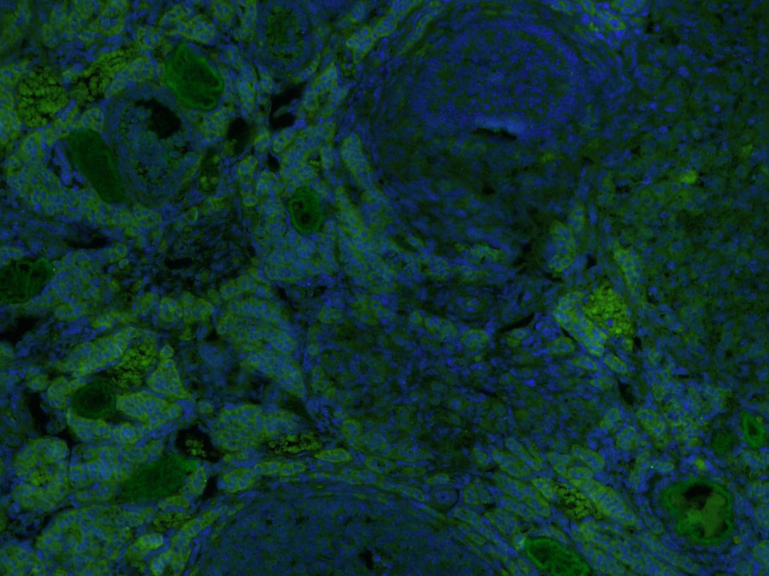 Paraformaldehyde-fixed, paraffin embedded (Mouse ovary); Antigen retrieval by boiling in sodium citrate buffer (pH6.0) for 15min; Block endogenous peroxidase by 3% hydrogen peroxide for 20 minutes; Blocking buffer (normal goat serum) at 37°C for 30min; Antibody incubation with (KIF13B) Polyclonal Antibody, Unconjugated (bs-12387R) at 1:400 overnight at 4°C, followed by a conjugated Goat Anti-Rabbit IgG antibody (bs-0295G-AF488) for 90 minutes, and DAPI for nuclei staining.