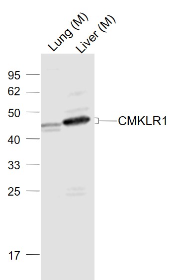 Sample: Lane 1: Lung (Mouse) Lysate at 40 ug Lane 2: Liver (Mouse) Lysate at 40 ug Primary: Anti-CMKLR1 (bs-10183R) at 1/1000 dilution Secondary: IRDye800CW Goat Anti-Rabbit IgG at 1/20000 dilution Predicted band size: 42 kD Observed band size: 42 kD