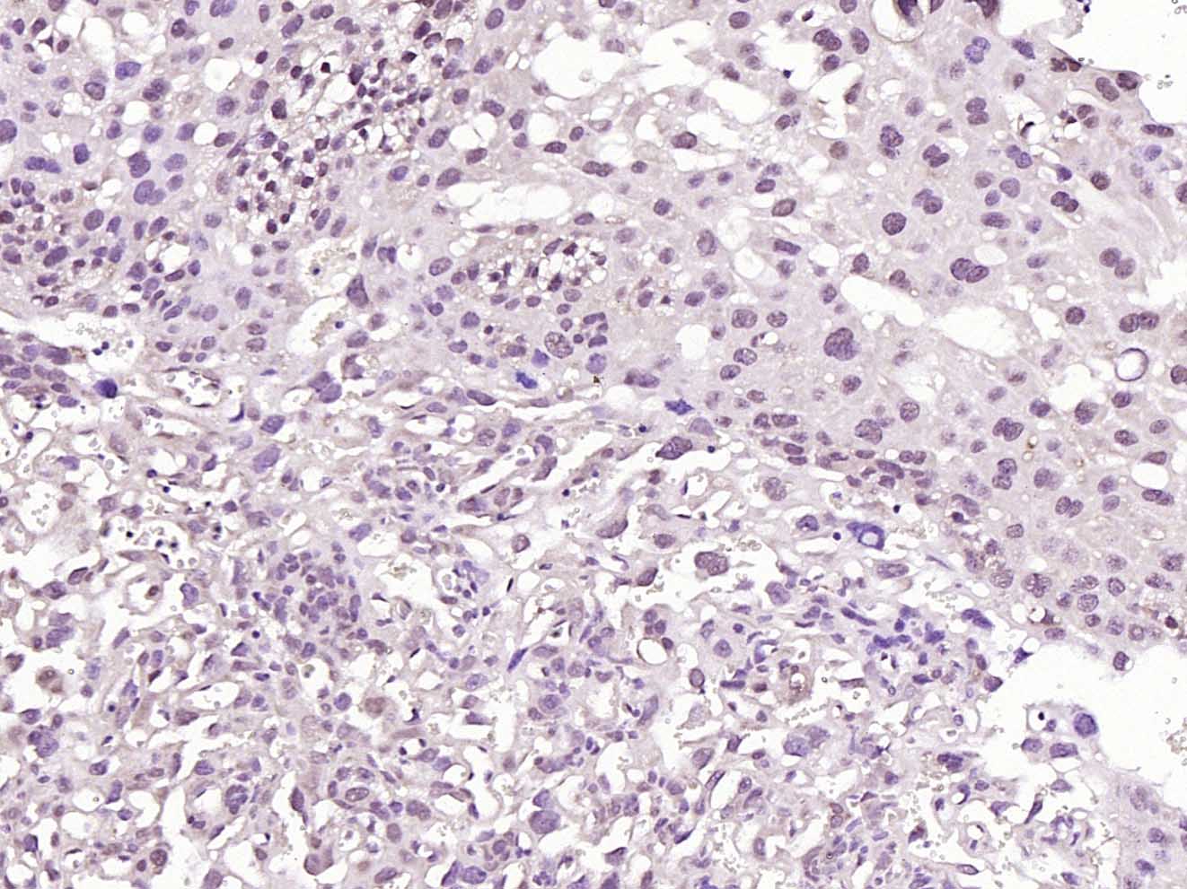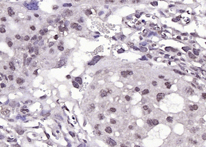 Paraformaldehyde-fixed, paraffin embedded (human cervical carcinoma); Antigen retrieval by boiling in sodium citrate buffer (pH6.0) for 15min; Block endogenous peroxidase by 3% hydrogen peroxide for 20 minutes; Blocking buffer (normal goat serum) at 37°C for 30min; Antibody incubation with (phospho-BRAF (Ser729) ) Polyclonal Antibody, Unconjugated (bs-12555R) at 1:200 overnight at 4°C, followed by operating according to SP Kit(Rabbit) (sp-0023) instructionsand DAB staining.