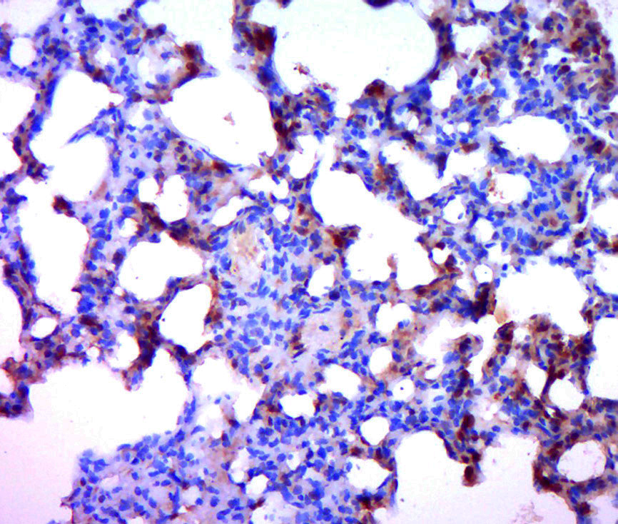 Paraformaldehyde-fixed, paraffin embedded (rat lung); Antigen retrieval by boiling in sodium citrate buffer (pH6.0) for 15min; Block endogenous peroxidase by 3% hydrogen peroxide for 20 minutes; Blocking buffer (normal goat serum) at 37°C for 30min; Antibody incubation with (BCL2) Polyclonal Antibody, Unconjugated (bs-12577R) at 1:400 overnight at 4°C, followed by a conjugated secondary (sp-0023) for 20 minutes and DAB staining.