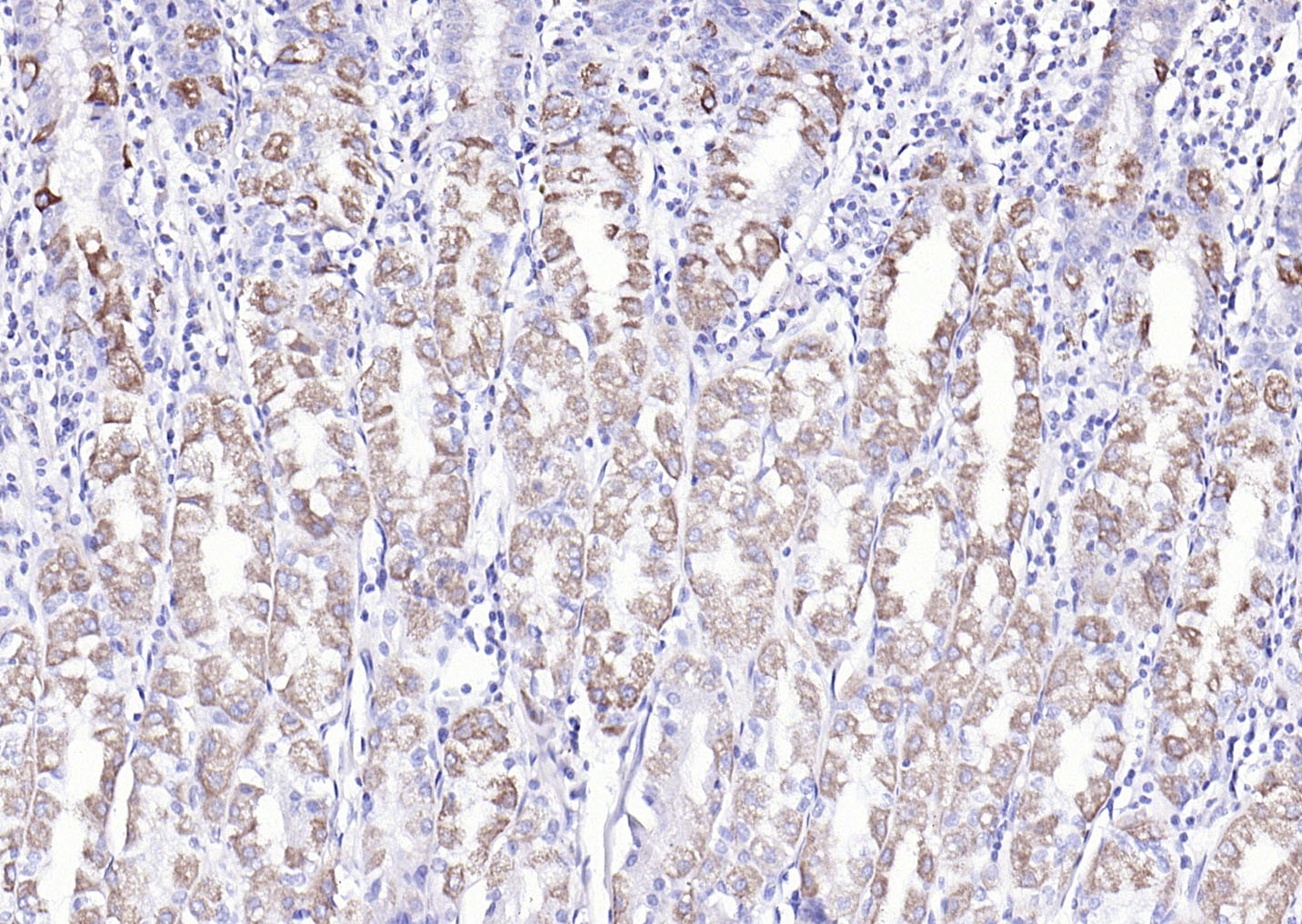 Paraformaldehyde-fixed, paraffin embedded (Human stomach); Antigen retrieval by boiling in sodium citrate buffer (pH6.0) for 15min; Block endogenous peroxidase by 3% hydrogen peroxide for 20 minutes; Blocking buffer (normal goat serum) at 37°C for 30min; Antibody incubation with (COX6c) Polyclonal Antibody, Unconjugated (bs-12925R) at 1:200 overnight at 4°C, followed by operating according to SP Kit(Rabbit) (sp-0023) instructionsand DAB staining.