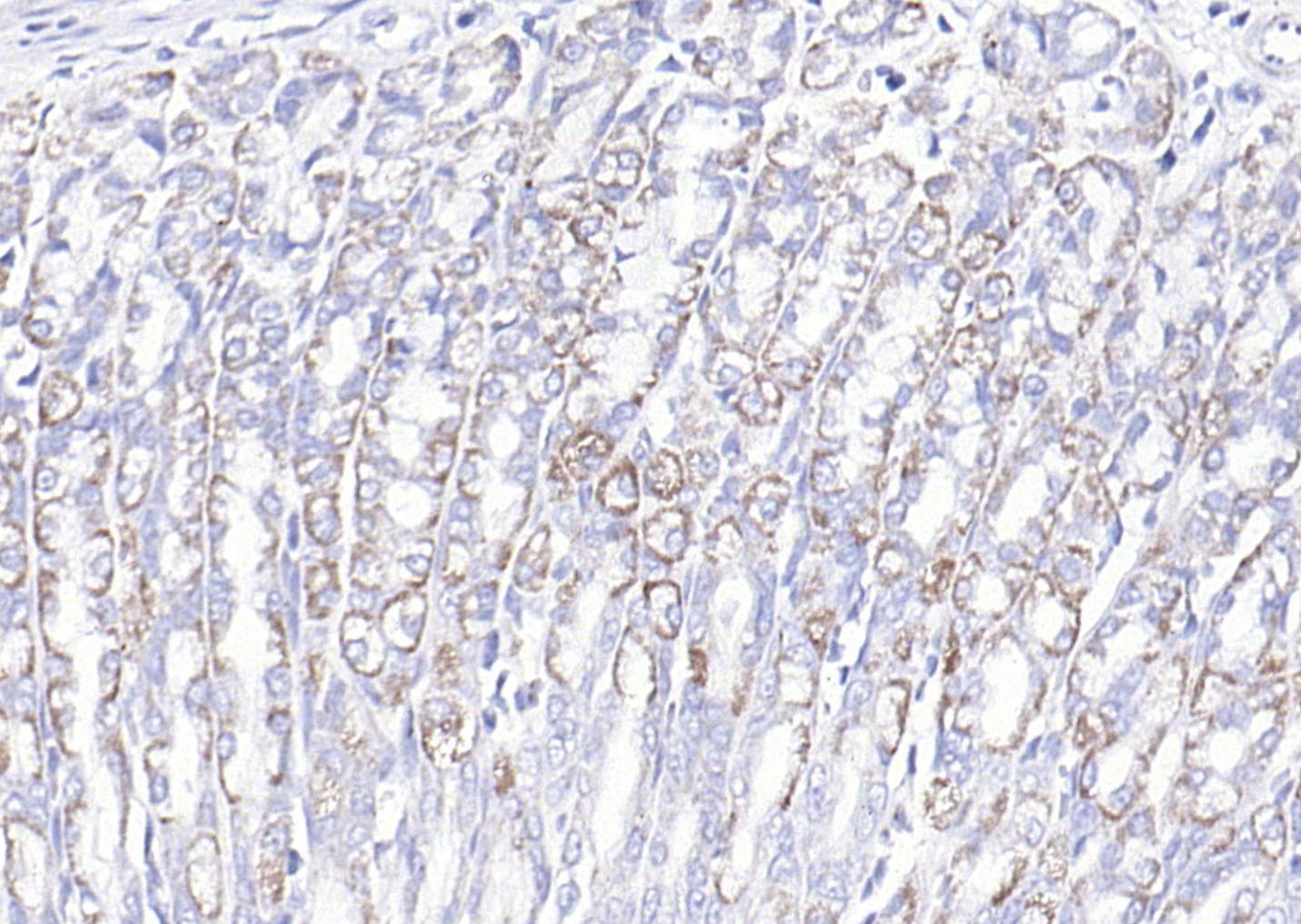 Paraformaldehyde-fixed, paraffin embedded (rat stomach); Antigen retrieval by boiling in sodium citrate buffer (pH6.0) for 15min; Block endogenous peroxidase by 3% hydrogen peroxide for 20 minutes; Blocking buffer (normal goat serum) at 37°C for 30min; Antibody incubation with (COX6c) Polyclonal Antibody, Unconjugated (bs-12925R) at 1:200 overnight at 4°C, followed by operating according to SP Kit(Rabbit) (sp-0023) instructionsand DAB staining.