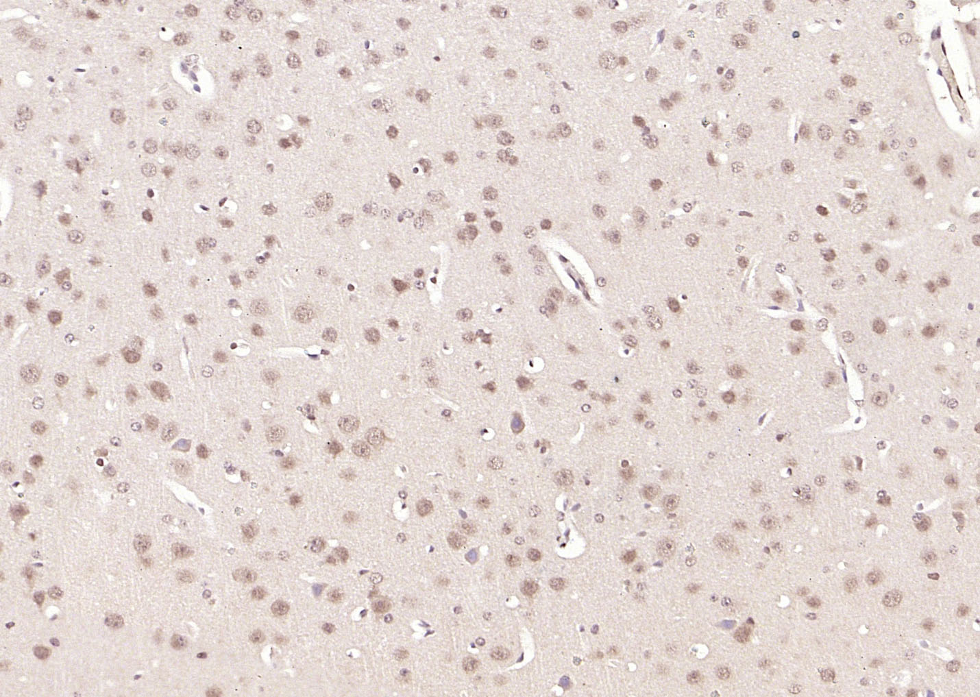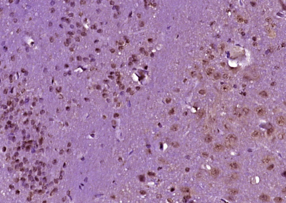 Paraformaldehyde-fixed, paraffin embedded (rat brain tissue); Antigen retrieval by boiling in sodium citrate buffer (pH6.0) for 15min; Block endogenous peroxidase by 3% hydrogen peroxide for 20 minutes; Blocking buffer (normal goat serum) at 37°C for 30min; Antibody incubation with (CWC22) Polyclonal Antibody, Unconjugated (bs-11464R) at 1:400 overnight at 4°C, followed by operating according to SP Kit(Rabbit) (sp-0023) instructionsand DAB staining.