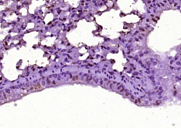 Paraformaldehyde-fixed, paraffin embedded (mouse lung tissue); Antigen retrieval by boiling in sodium citrate buffer (pH6.0) for 15min; Block endogenous peroxidase by 3% hydrogen peroxide for 20 minutes; Blocking buffer (normal goat serum) at 37°C for 30min; Antibody incubation with (CWC22) Polyclonal Antibody, Unconjugated (bs-11464R) at 1:400 overnight at 4°C, followed by operating according to SP Kit(Rabbit) (sp-0023) instructionsand DAB staining.