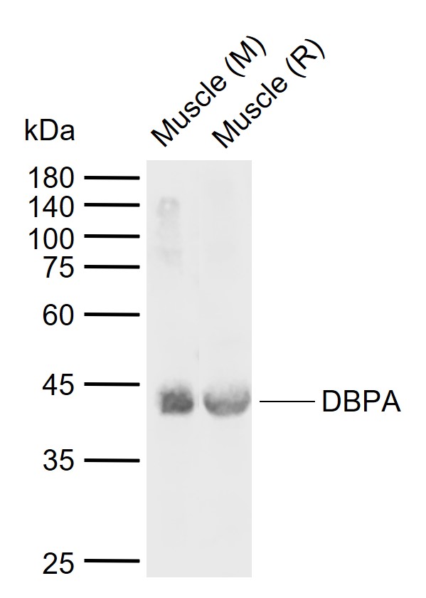 Paraformaldehyde-fixed, paraffin embedded (rat skeletal muscle); Antigen retrieval by boiling in sodium citrate buffer (pH6.0) for 15min; Block endogenous peroxidase by 3% hydrogen peroxide for 20 minutes; Blocking buffer (normal goat serum) at 37°C for 30min; Antibody incubation with (DBPA) Polyclonal Antibody, Unconjugated (bs-12985R) at 1:200 overnight at 4°C, followed by operating according to SP Kit(Rabbit) (sp-0023) instructionsand DAB staining.