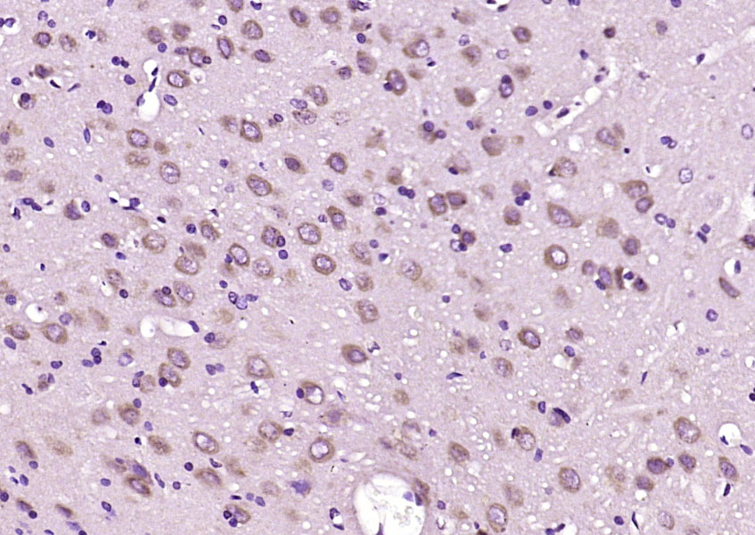 Paraformaldehyde-fixed, paraffin embedded (rat brain); Antigen retrieval by boiling in sodium citrate buffer (pH6.0) for 15min; Block endogenous peroxidase by 3% hydrogen peroxide for 20 minutes; Blocking buffer (normal goat serum) at 37°C for 30min; Antibody incubation with (EEF1G) Polyclonal Antibody, Unconjugated (bs-13056R) at 1:200 overnight at 4°C, followed by operating according to SP Kit(Rabbit) (sp-0023) instructionsand DAB staining.