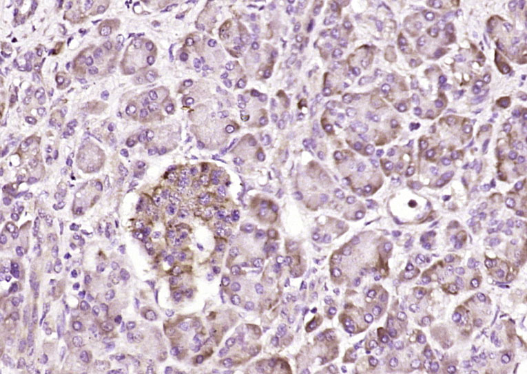 Paraformaldehyde-fixed, paraffin embedded (human pancreatic cancer); Antigen retrieval by boiling in sodium citrate buffer (pH6.0) for 15min; Block endogenous peroxidase by 3% hydrogen peroxide for 20 minutes; Blocking buffer (normal goat serum) at 37°C for 30min; Antibody incubation with (EEF1G) Polyclonal Antibody, Unconjugated (bs-13056R) at 1:200 overnight at 4°C, followed by operating according to SP Kit(Rabbit) (sp-0023) instructionsand DAB staining.