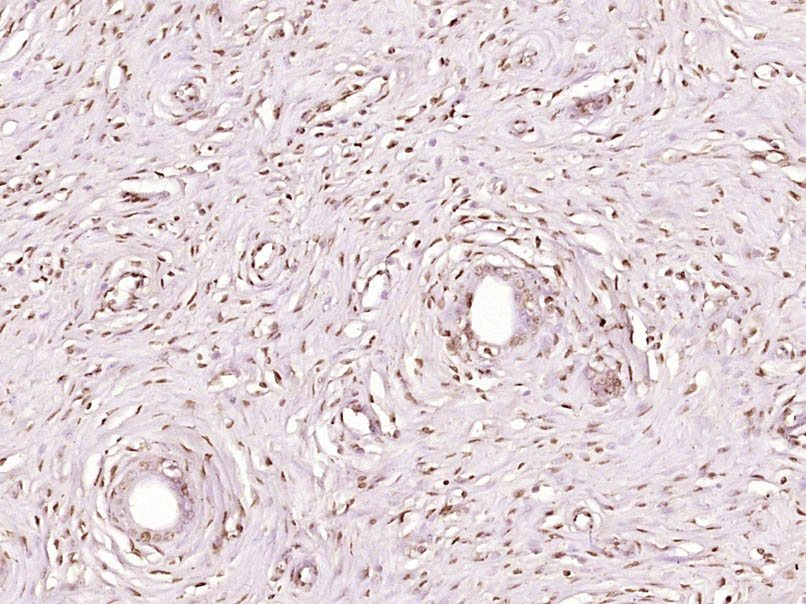 Paraformaldehyde-fixed, paraffin embedded (Rat uterus); Antigen retrieval by boiling in sodium citrate buffer (pH6.0) for 15min; Block endogenous peroxidase by 3% hydrogen peroxide for 20 minutes; Blocking buffer (normal goat serum) at 37°C for 30min; Antibody incubation with (TRRAP) Polyclonal Antibody, Unconjugated (bs-13146R) at 1:400 overnight at 4°C, followed by operating according to SP Kit(Rabbit) (sp-0023) instructionsand DAB staining.
