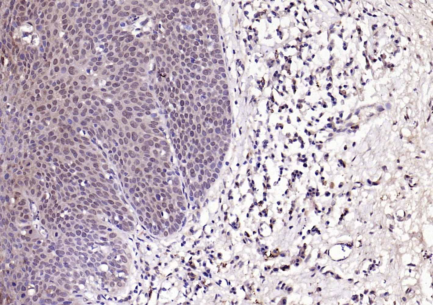 Paraformaldehyde-fixed, paraffin embedded (human laryngeal carcinoma); Antigen retrieval by boiling in sodium citrate buffer (pH6.0) for 15min; Block endogenous peroxidase by 3% hydrogen peroxide for 20 minutes; Blocking buffer (normal goat serum) at 37°C for 30min; Antibody incubation with (Phospho-FGFR1 (Tyr154)) Polyclonal Antibody, Unconjugated (bs-13155R) at 1:200 overnight at 4°C, followed by operating according to SP Kit(Rabbit) (sp-0023) instructionsand DAB staining.