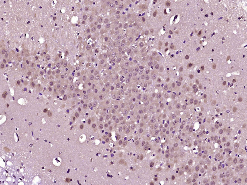 Paraformaldehyde-fixed, paraffin embedded (Rat brain); Antigen retrieval by boiling in sodium citrate buffer (pH6.0) for 15min; Block endogenous peroxidase by 3% hydrogen peroxide for 20 minutes; Blocking buffer (normal goat serum) at 37°C for 30min; Antibody incubation with (FbxL4) Polyclonal Antibody, Unconjugated (bs-13166R) at 1:400 overnight at 4°C, followed by operating according to SP Kit(Rabbit) (sp-0023) instructionsand DAB staining.