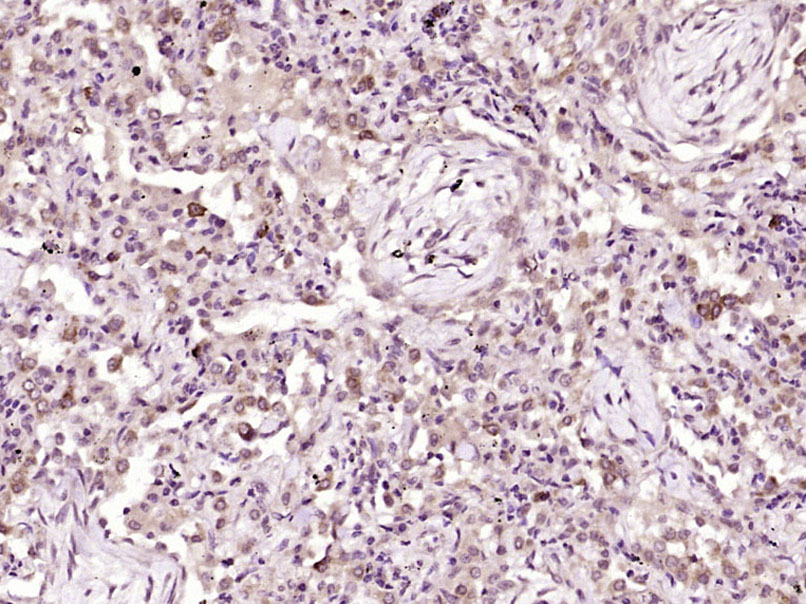 Paraformaldehyde-fixed, paraffin embedded (Human lung carcinoma); Antigen retrieval by boiling in sodium citrate buffer (pH6.0) for 15min; Block endogenous peroxidase by 3% hydrogen peroxide for 20 minutes; Blocking buffer (normal goat serum) at 37°C for 30min; Antibody incubation with (FbxL4) Polyclonal Antibody, Unconjugated (bs-13166R) at 1:400 overnight at 4°C, followed by operating according to SP Kit(Rabbit) (sp-0023) instructionsand DAB staining.