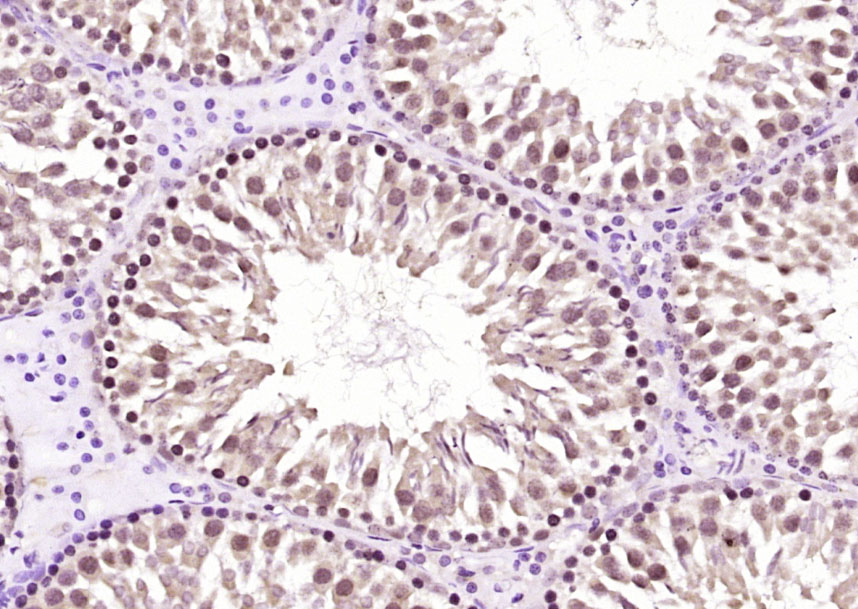 Paraformaldehyde-fixed, paraffin embedded (rat testis); Antigen retrieval by boiling in sodium citrate buffer (pH6.0) for 15min; Block endogenous peroxidase by 3% hydrogen peroxide for 20 minutes; Blocking buffer (normal goat serum) at 37°C for 30min; Antibody incubation with (FMN1) Polyclonal Antibody, Unconjugated (bs-13185R) at 1:200 overnight at 4°C, followed by operating according to SP Kit(Rabbit) (sp-0023) instructionsand DAB staining.