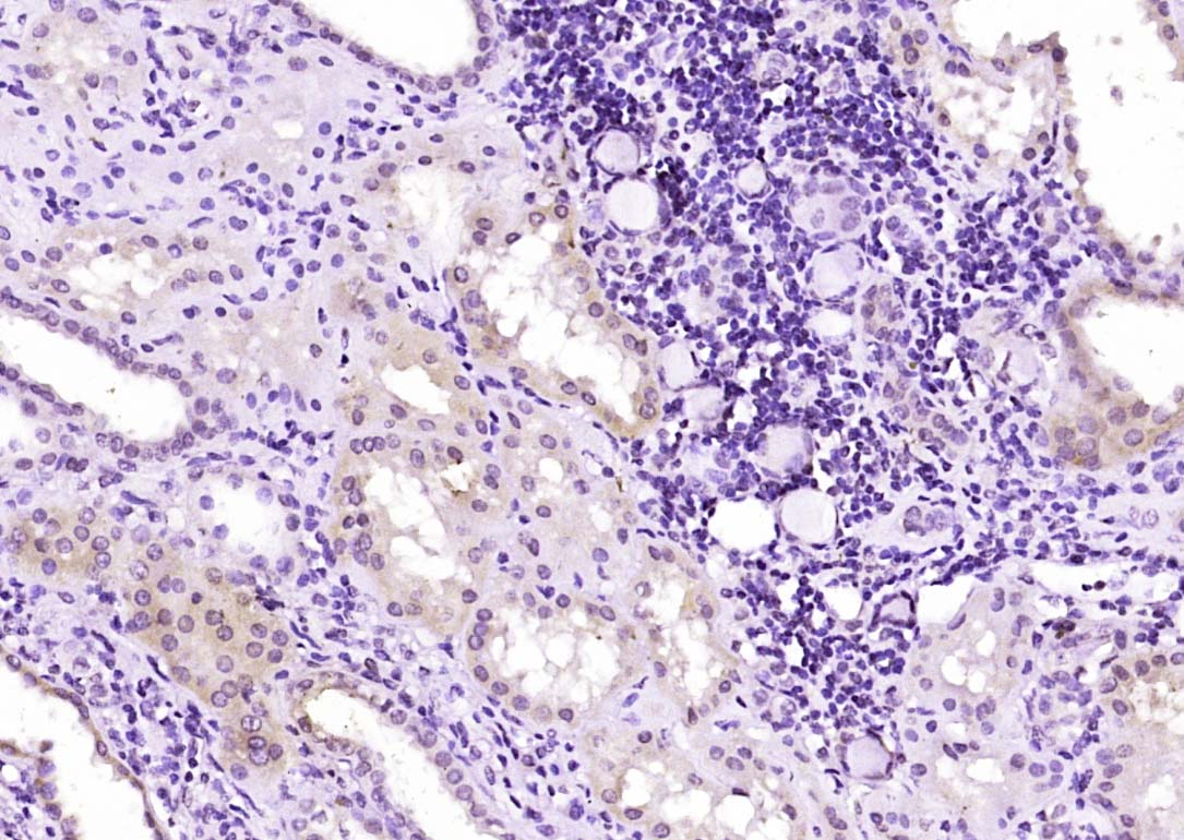 Paraformaldehyde-fixed, paraffin embedded (Human kidney); Antigen retrieval by boiling in sodium citrate buffer (pH6.0) for 15min; Block endogenous peroxidase by 3% hydrogen peroxide for 20 minutes; Blocking buffer (normal goat serum) at 37°C for 30min; Antibody incubation with (FMN1) Polyclonal Antibody, Unconjugated (bs-13185R) at 1:200 overnight at 4°C, followed by operating according to SP Kit(Rabbit) (sp-0023) instructionsand DAB staining.