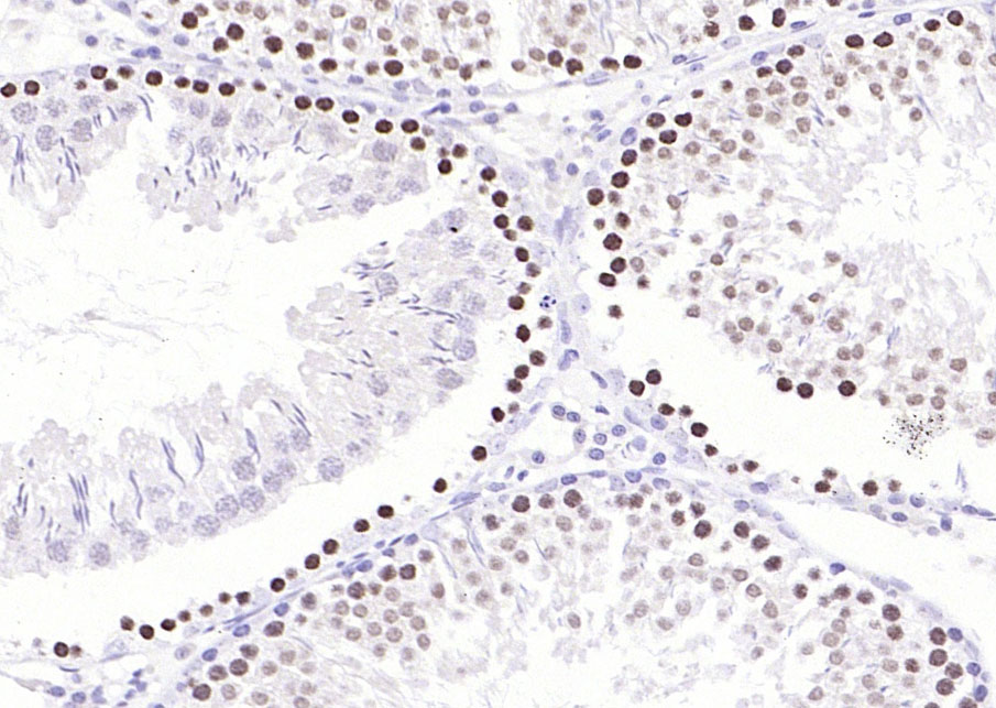 Paraformaldehyde-fixed, paraffin embedded (rat testis); Antigen retrieval by boiling in sodium citrate buffer (pH6.0) for 15min; Block endogenous peroxidase by 3% hydrogen peroxide for 20 minutes; Blocking buffer (normal goat serum) at 37°C for 30min; Antibody incubation with (phospho-FMRP (Ser500)) Polyclonal Antibody, Unconjugated (bs-13188R) at 1:200 overnight at 4°C, followed by operating according to SP Kit(Rabbit) (sp-0023) instructionsand DAB staining.