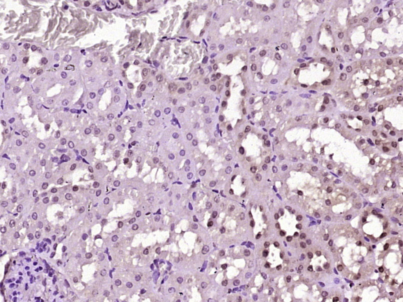 Paraformaldehyde-fixed, paraffin embedded (Rat kidney); Antigen retrieval by boiling in sodium citrate buffer (pH6.0) for 15min; Block endogenous peroxidase by 3% hydrogen peroxide for 20 minutes; Blocking buffer (normal goat serum) at 37°C for 30min; Antibody incubation with (GABPA) Polyclonal Antibody, Unconjugated (bs-13261R) at 1:400 overnight at 4°C, followed by operating according to SP Kit(Rabbit) (sp-0023) instructionsand DAB staining.