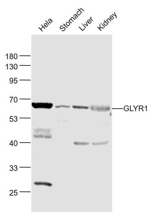 Sample: Hela(Human) Cell Lysate at 30 ug Stomach (Mouse) Lysate at 40 ug Liver (Mouse) Lysate at 40 ug Kidney (Mouse) Lysate at 40 ug Primary: Anti- GLYR1 (bs-13451R) at 1/1000 dilution Secondary: IRDye800CW Goat Anti-Rabbit IgG at 1/20000 dilution Predicted band size: 61 kD Observed band size: 61 kD