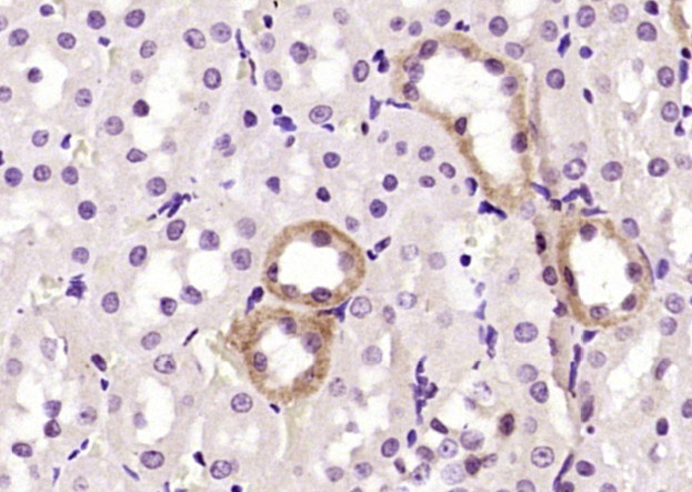 Paraformaldehyde-fixed, paraffin embedded (rat kidney); Antigen retrieval by boiling in sodium citrate buffer (pH6.0) for 15min; Block endogenous peroxidase by 3% hydrogen peroxide for 20 minutes; Blocking buffer (normal goat serum) at 37°C for 30min; Antibody incubation with (GOT1L1) Polyclonal Antibody, Unconjugated (bs-13494R) at 1:200 overnight at 4°C, followed by operating according to SP Kit(Rabbit) (sp-0023) instructionsand DAB staining.
