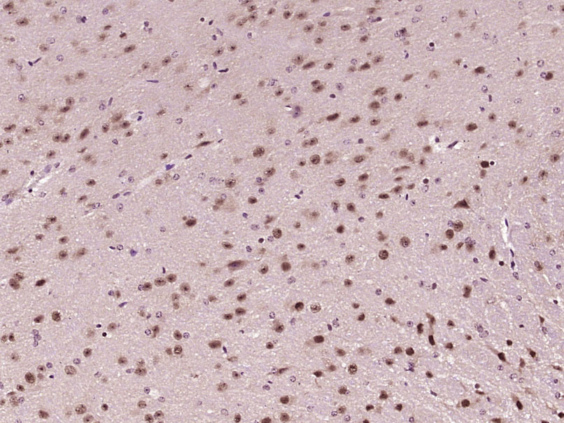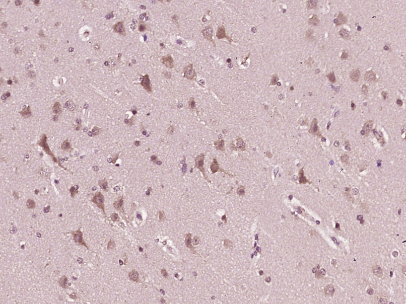 Paraformaldehyde-fixed, paraffin embedded (Mouse brain); Antigen retrieval by boiling in sodium citrate buffer (pH6.0) for 15min; Block endogenous peroxidase by 3% hydrogen peroxide for 20 minutes; Blocking buffer (normal goat serum) at 37°C for 30min; Antibody incubation with (hHR23b) Polyclonal Antibody, Unconjugated (bs-15482R) at 1:400 overnight at 4°C, followed by operating according to SP Kit(Rabbit) (sp-0023) instructionsand DAB staining.