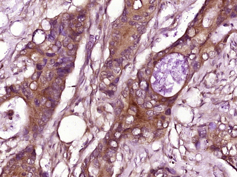 Paraformaldehyde-fixed, paraffin embedded (human cervical carcinoma); Antigen retrieval by boiling in sodium citrate buffer (pH6.0) for 15min; Block endogenous peroxidase by 3% hydrogen peroxide for 20 minutes; Blocking buffer (normal goat serum) at 37°C for 30min; Antibody incubation with (CCL26) Polyclonal Antibody, Unconjugated (bs-15512R) at 1:400 overnight at 4°C, followed by operating according to SP Kit(Rabbit) (sp-0023) instructionsand DAB staining.