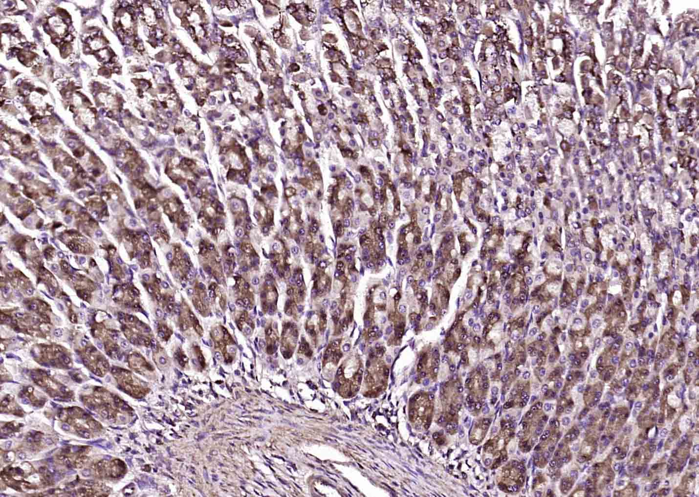 Paraformaldehyde-fixed, paraffin embedded (rat stomach); Antigen retrieval by boiling in sodium citrate buffer (pH6.0) for 15min; Block endogenous peroxidase by 3% hydrogen peroxide for 20 minutes; Blocking buffer (normal goat serum) at 37°C for 30min; Antibody incubation with (ICK) Polyclonal Antibody, Unconjugated (bs-15536R) at 1:200 overnight at 4°C, followed by operating according to SP Kit(Rabbit) (sp-0023) instructionsand DAB staining.