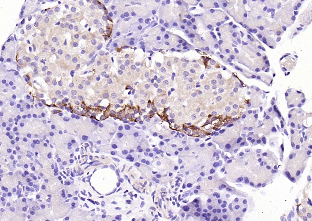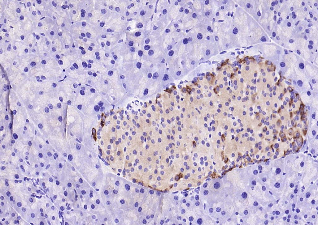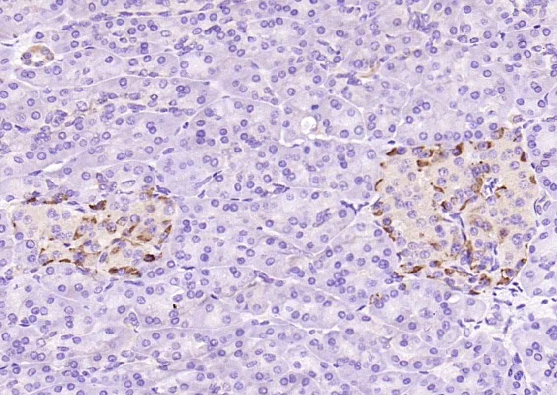 Paraformaldehyde-fixed, paraffin embedded (mouse pancreas); Antigen retrieval by boiling in sodium citrate buffer (pH6.0) for 15min; Block endogenous peroxidase by 3% hydrogen peroxide for 20 minutes; Blocking buffer (normal goat serum) at 37°C for 30min; Incubation with (GSK3 Alpha + Beta) Polyclonal Antibody, Unconjugated (bs-7332R) at 1:200 overnight at 4°C, followed by operating according to SP Kit(Rabbit) (sp-0023) instructionsand DAB staining.