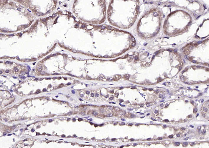 Paraformaldehyde-fixed, paraffin embedded (Human kidney); Antigen retrieval by boiling in sodium citrate buffer (pH6.0) for 15min; Block endogenous peroxidase by 3% hydrogen peroxide for 20 minutes; Blocking buffer (normal goat serum) at 37°C for 30min; Antibody incubation with (TRA1 variant) Polyclonal Antibody, Unconjugated (bs-0149R) at 1:200 overnight at 4°C, followed by operating according to SP Kit(Rabbit) (sp-0023) instructionsand DAB staining.