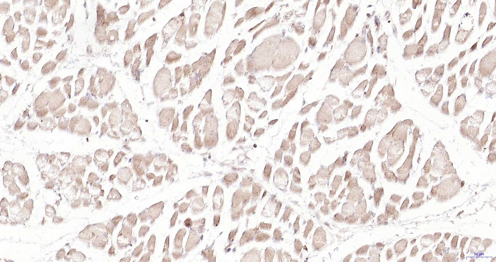 Paraformaldehyde-fixed, paraffin embedded Human Skeletal muscle; Antigen retrieval by boiling in sodium citrate buffer (pH6.0) for 15 min; Antibody incubation with SIRT2 Polyclonal Antibody, Unconjugated (bs-7350R) at 1:200 overnight at 4°C, followed by conjugation to the SP Kit (Rabbit, SP-0023) and DAB (C-0010) staining.