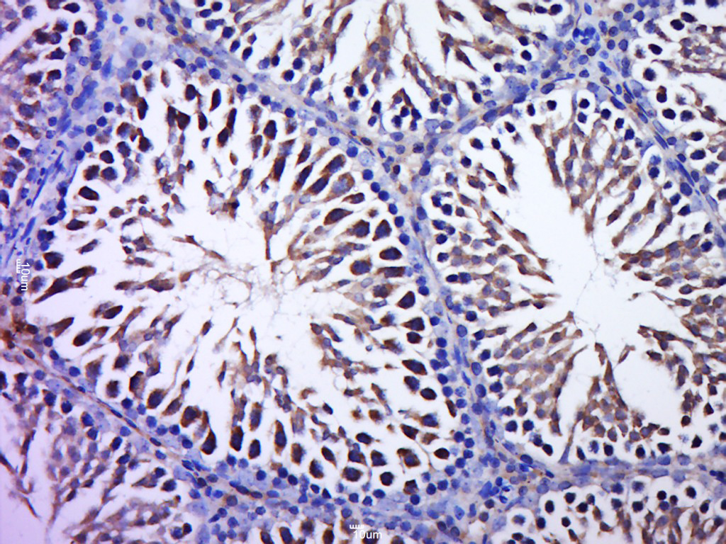 Paraformaldehyde-fixed, paraffin embedded (Rat testis); Antigen retrieval by boiling in sodium citrate buffer (pH6.0) for 15min; Block endogenous peroxidase by 3% hydrogen peroxide for 20 minutes; Blocking buffer (normal goat serum) at 37°C for 30min; Antibody incubation with (Poly(A) binding protein 4 like; PABPC4L) Polyclonal Antibody, Unconjugated (bs-13767R) at 1:400 overnight at 4°C, followed by a conjugated secondary (sp-0023) for 20 minutes and DAB staining.