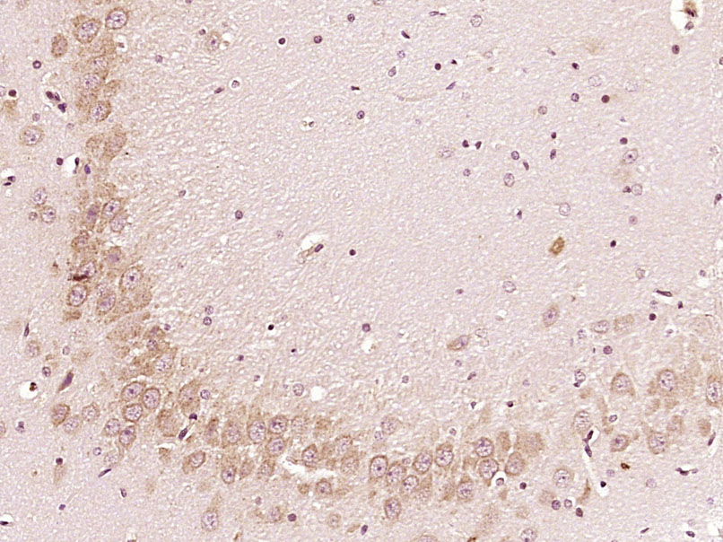Paraformaldehyde-fixed, paraffin embedded (Rat brain); Antigen retrieval by boiling in sodium citrate buffer (pH6.0) for 15min; Block endogenous peroxidase by 3% hydrogen peroxide for 20 minutes; Blocking buffer (normal goat serum) at 37°C for 30min; Antibody incubation with (C19orf61) Polyclonal Antibody, Unconjugated (bs-13792R) at 1:400 overnight at 4°C, followed by operating according to SP Kit(Rabbit) (sp-0023) instructionsand DAB staining.