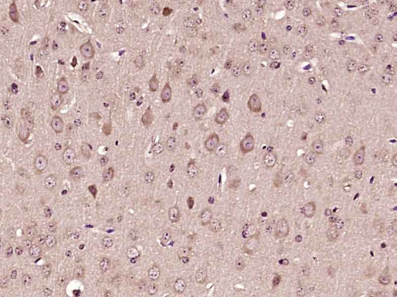 Paraformaldehyde-fixed, paraffin embedded (Mouse brain); Antigen retrieval by boiling in sodium citrate buffer (pH6.0) for 15min; Block endogenous peroxidase by 3% hydrogen peroxide for 20 minutes; Blocking buffer (normal goat serum) at 37°C for 30min; Antibody incubation with (COX6A1) Polyclonal Antibody, Unconjugated (bs-14007R) at 1:400 overnight at 4°C, followed by operating according to SP Kit(Rabbit) (sp-0023) instructionsand DAB staining.