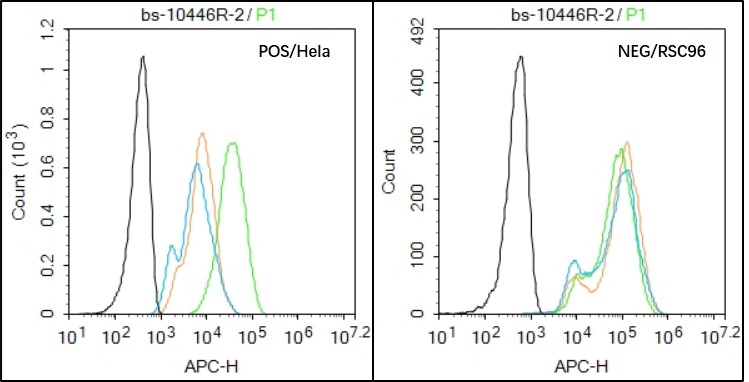 Hela(Positive)and RSC96(Negative control)cells (black) were fixed with 4% PFA for 10min at room temperature, permeabilized with 90% ice-cold methanol for 20 min at -20℃, and incubated in 5% BSA blocking buffer for 30 min at room temperature. Cells were then stained with HPV16 E7 Antibody(bs-10446R)at 1:50 dilution in blocking buffer and incubated for 30 min at room temperature, washed twice with 2% BSA in PBS, followed by secondary antibody(blue) incubation for 40 min at room temperature. Acquisitions of 20,000 events were performed. Cells stained with primary antibody (green), and isotype control (orange).