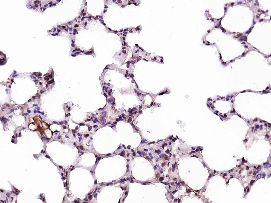 Paraformaldehyde-fixed, paraffin embedded (rat lung); Antigen retrieval by boiling in sodium citrate buffer (pH6.0) for 15min; Block endogenous peroxidase by 3% hydrogen peroxide for 20 minutes; Blocking buffer (normal goat serum) at 37°C for 30min; Antibody incubation with (Cyclophilin E) Polyclonal Antibody, Unconjugated (bs-14138R) at 1:200 overnight at 4°C, followed by operating according to SP Kit(Rabbit) (sp-0023) instructionsand DAB staining.