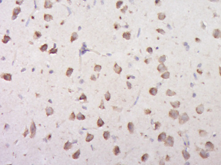 Paraformaldehyde-fixed, paraffin embedded (Rat brain); Antigen retrieval by boiling in sodium citrate buffer (pH6.0) for 15min; Block endogenous peroxidase by 3% hydrogen peroxide for 20 minutes; Blocking buffer (normal goat serum) at 37°C for 30min; Antibody incubation with (DDX1) Polyclonal Antibody, Unconjugated (bs-14214R) at 1:400 overnight at 4°C, followed by operating according to SP Kit(Rabbit) (sp-0023) instructionsand DAB staining.