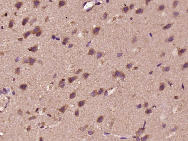 Paraformaldehyde-fixed, paraffin embedded (rat brain tissue); Antigen retrieval by boiling in sodium citrate buffer (pH6.0) for 15min; Block endogenous peroxidase by 3% hydrogen peroxide for 20 minutes; Blocking buffer (normal goat serum) at 37°C for 30min; Antibody incubation with (DHX37) Polyclonal Antibody, Unconjugated (bs-14320R) at 1:400 overnight at 4°C, followed by operating according to SP Kit(Rabbit) (sp-0023) instructionsand DAB staining.