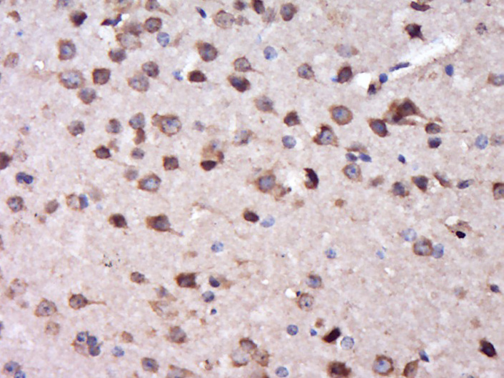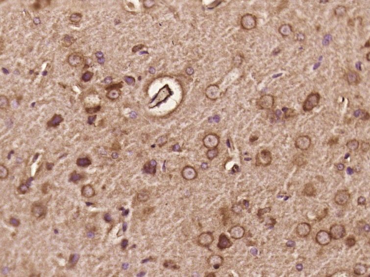 Paraformaldehyde-fixed, paraffin embedded (rat brain tissue); Antigen retrieval by boiling in sodium citrate buffer (pH6.0) for 15min; Block endogenous peroxidase by 3% hydrogen peroxide for 20 minutes; Blocking buffer (normal goat serum) at 37°C for 30min; Antibody incubation with (DOC2B)) Polyclonal Antibody, Unconjugated (bs-14402R) at 1:400 overnight at 4°C, followed by operating according to SP Kit(Rabbit) (sp-0023) instructionsand DAB staining.