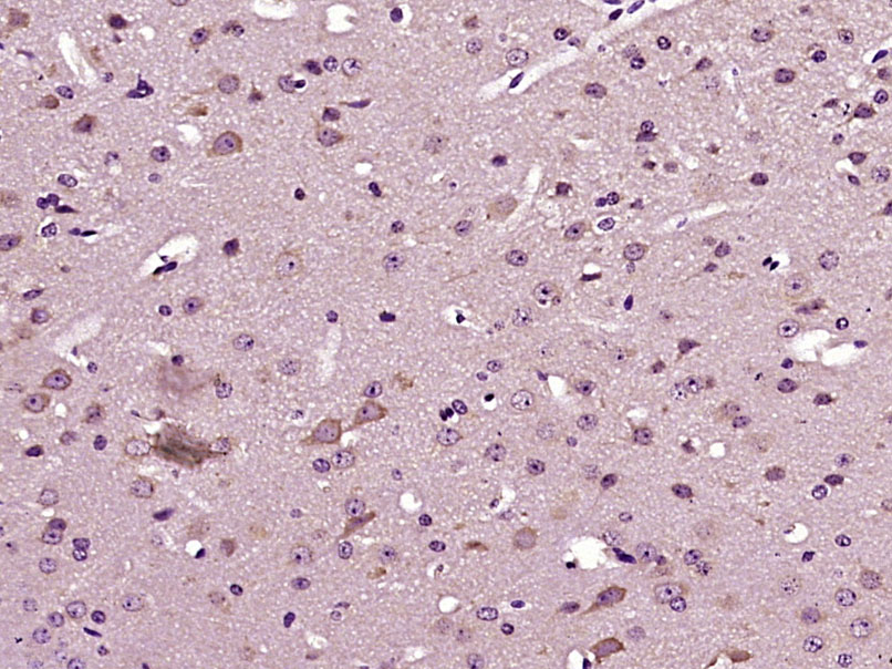 Paraformaldehyde-fixed, paraffin embedded (Mouse brain); Antigen retrieval by boiling in sodium citrate buffer (pH6.0) for 15min; Block endogenous peroxidase by 3% hydrogen peroxide for 20 minutes; Blocking buffer (normal goat serum) at 37°C for 30min; Antibody incubation with (DYRK4) Polyclonal Antibody, Unconjugated (bs-14474R) at 1:400 overnight at 4°C, followed by operating according to SP Kit(Rabbit) (sp-0023) instructionsand DAB staining.