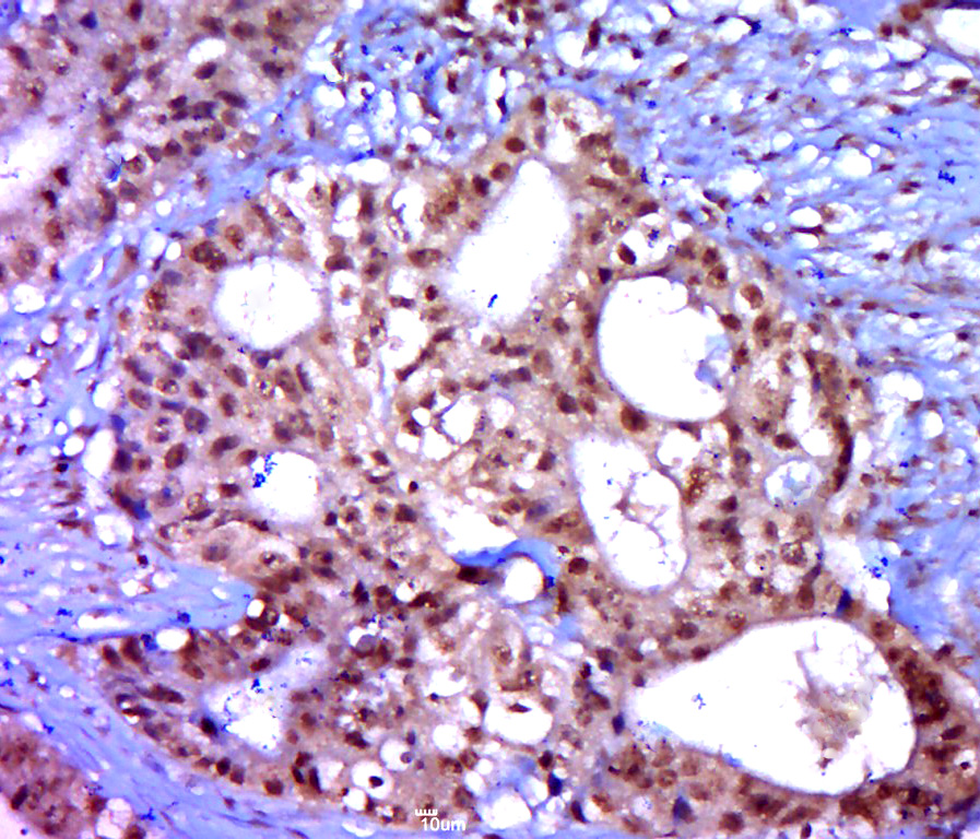 Paraformaldehyde-fixed, paraffin embedded (Human liver cancer); Antigen retrieval by boiling in sodium citrate buffer (pH6.0) for 15min; Block endogenous peroxidase by 3% hydrogen peroxide for 20 minutes; Blocking buffer (normal goat serum) at 37°C for 30min; Antibody incubation with (p-eIF2B epsilon (Ser539)) Polyclonal Antibody, Unconjugated (bs-14519R) at 1:400 overnight at 4°C, followed by operating according to SP Kit(Rabbit) (sp-0023) instructionsand DAB staining.