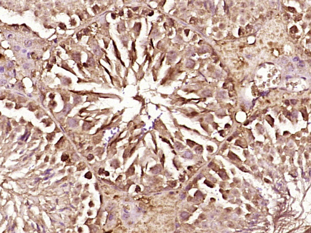 Paraformaldehyde-fixed, paraffin embedded (rat testis tissue); Antigen retrieval by boiling in sodium citrate buffer (pH6.0) for 15min; Block endogenous peroxidase by 3% hydrogen peroxide for 20 minutes; Blocking buffer (normal goat serum) at 37°C for 30min; Antibody incubation with (CFLAR) Polyclonal Antibody, Unconjugated (bs-8855R) at 1:400 overnight at 4°C, followed by operating according to SP Kit(Rabbit) (sp-0023) instructionsand DAB staining.