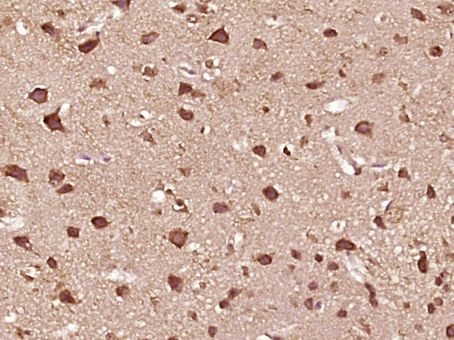 Paraformaldehyde-fixed, paraffin embedded (mouse brain tissue); Antigen retrieval by boiling in sodium citrate buffer (pH6.0) for 15min; Block endogenous peroxidase by 3% hydrogen peroxide for 20 minutes; Blocking buffer (normal goat serum) at 37°C for 30min; Antibody incubation with (CFLAR) Polyclonal Antibody, Unconjugated (bs-8855R) at 1:400 overnight at 4°C, followed by operating according to SP Kit(Rabbit) (sp-0023) instructionsand DAB staining.