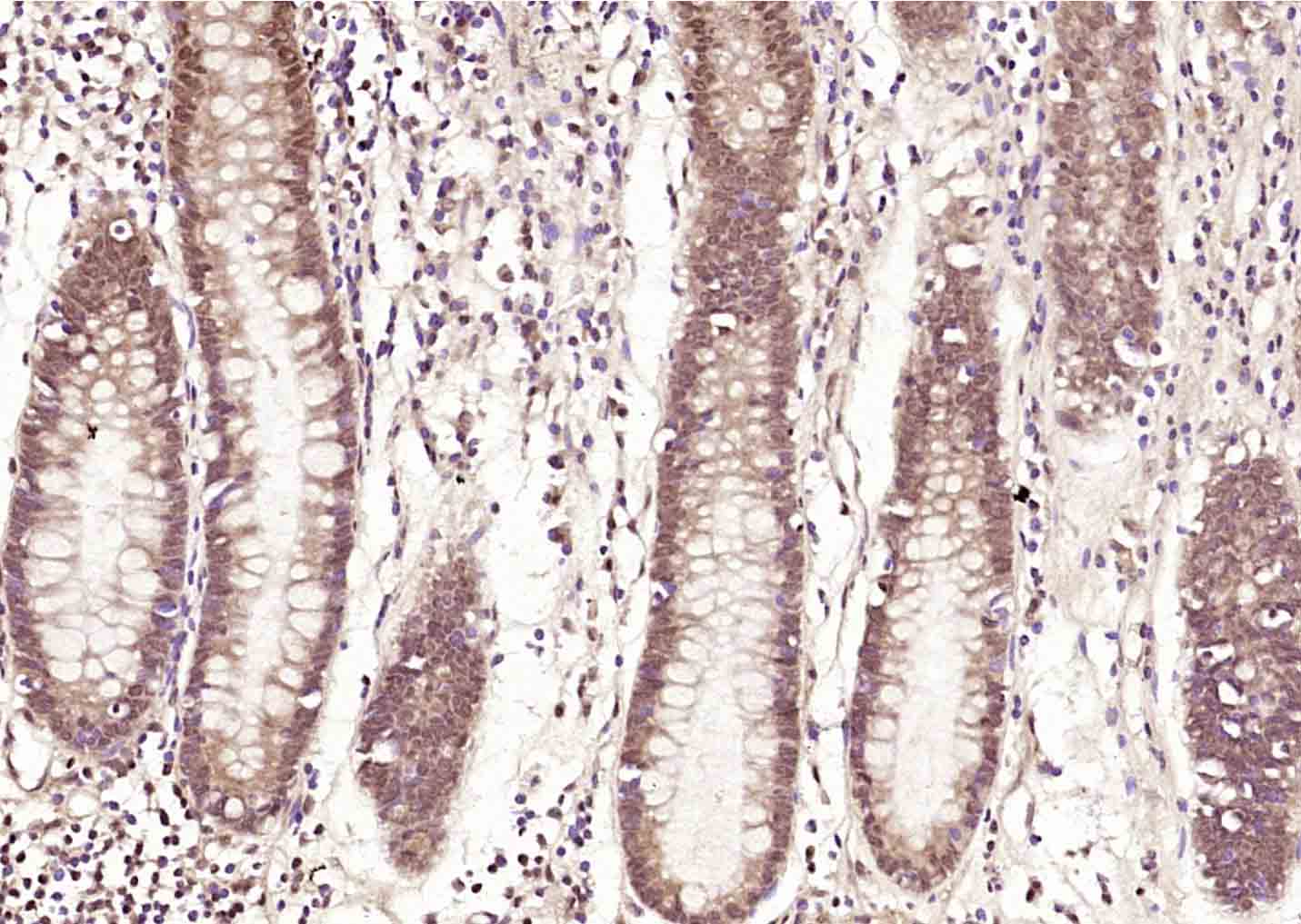Paraformaldehyde-fixed, paraffin embedded (human colon carcinoma); Antigen retrieval by boiling in sodium citrate buffer (pH6.0) for 15min; Block endogenous peroxidase by 3% hydrogen peroxide for 20 minutes; Blocking buffer (normal goat serum) at 37°C for 30min; Antibody incubation with (PER-3) Polyclonal Antibody, Unconjugated (bs-4498R) at 1:200 overnight at 4°C, followed by operating according to SP Kit(Rabbit) (sp-0023) instructionsand DAB staining.