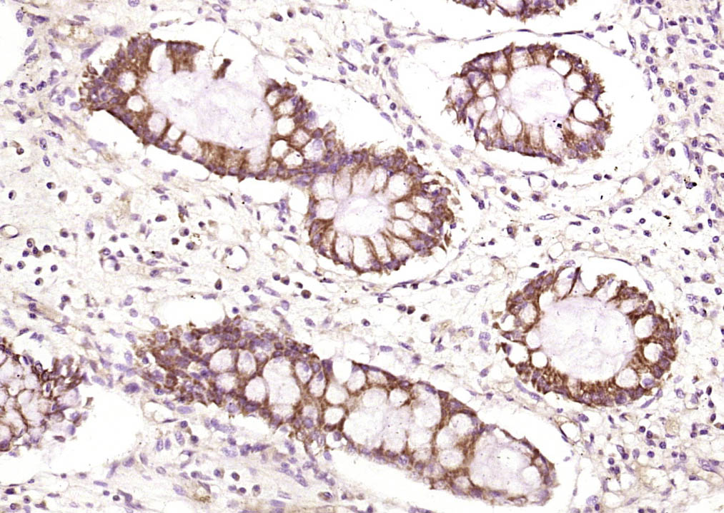 Paraformaldehyde-fixed, paraffin embedded (human colon carcinoma); Antigen retrieval by boiling in sodium citrate buffer (pH6.0) for 15min; Block endogenous peroxidase by 3% hydrogen peroxide for 20 minutes; Blocking buffer (normal goat serum) at 37°C for 30min; Antibody incubation with (FMNL3) Polyclonal Antibody, Unconjugated (bs-16151R) at 1:200 overnight at 4°C, followed by operating according to SP Kit(Rabbit) (sp-0023) instructionsand DAB staining.