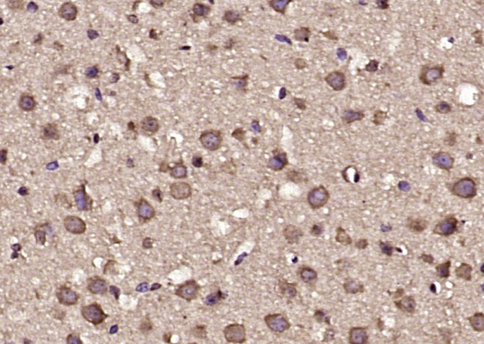 Paraformaldehyde-fixed, paraffin embedded (mouse brain); Antigen retrieval by boiling in sodium citrate buffer (pH6.0) for 15min; Block endogenous peroxidase by 3% hydrogen peroxide for 20 minutes; Blocking buffer (normal goat serum) at 37°C for 30min; Antibody incubation with (FOXK1) Polyclonal Antibody, Unconjugated (bs-16168R) at 1:200 overnight at 4°C, followed by operating according to SP Kit(Rabbit) (sp-0023) instructionsand DAB staining.