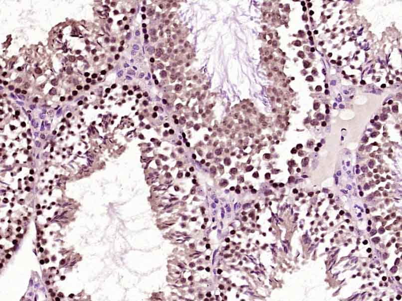 Paraformaldehyde-fixed, paraffin embedded (Mouse testis); Antigen retrieval by boiling in sodium citrate buffer (pH6.0) for 15min; Block endogenous peroxidase by 3% hydrogen peroxide for 20 minutes; Blocking buffer (normal goat serum) at 37°C for 30min; Antibody incubation with (GTF3C4) Polyclonal Antibody, Unconjugated (bs-16360R) at 1:400 overnight at 4°C, followed by operating according to SP Kit(Rabbit) (sp-0023) instructionsand DAB staining.