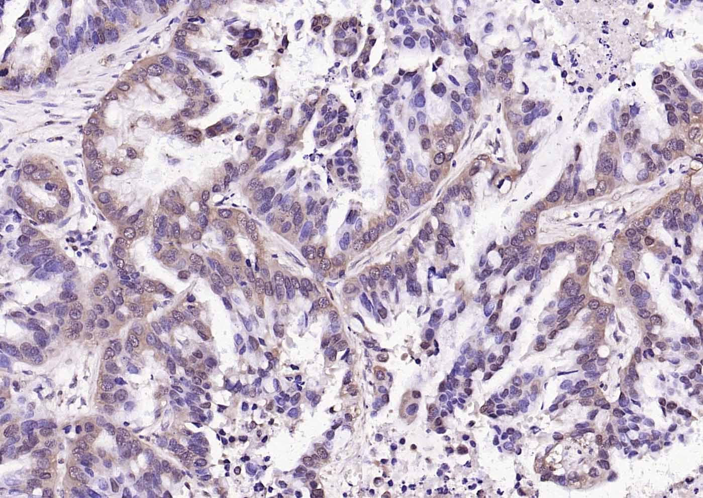 Paraformaldehyde-fixed, paraffin embedded (human lung carcinoma); Antigen retrieval by boiling in sodium citrate buffer (pH6.0) for 15min; Block endogenous peroxidase by 3% hydrogen peroxide for 20 minutes; Blocking buffer (normal goat serum) at 37°C for 30min; Incubation with (phospho-HSF1 (Ser303 + Ser307)) Polyclonal Antibody, Unconjugated (bs-16556R) at 1:200 overnight at 4°C, followed by operating according to SP Kit(Rabbit) (sp-0023) instructionsand DAB staining.