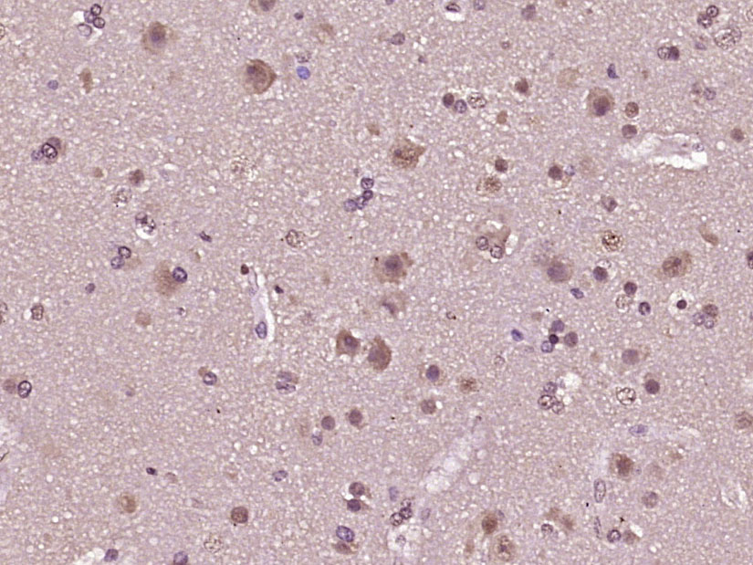 Paraformaldehyde-fixed, paraffin embedded (human brain glioma); Antigen retrieval by boiling in sodium citrate buffer (pH6.0) for 15min; Block endogenous peroxidase by 3% hydrogen peroxide for 20 minutes; Blocking buffer (normal goat serum) at 37°C for 30min; Antibody incubation with (HSF1(Ser303 + Ser307)) Polyclonal Antibody, Unconjugated (bs-16556R) at 1:400 overnight at 4°C, followed by operating according to SP Kit(Rabbit) (sp-0023) instructionsand DAB staining.