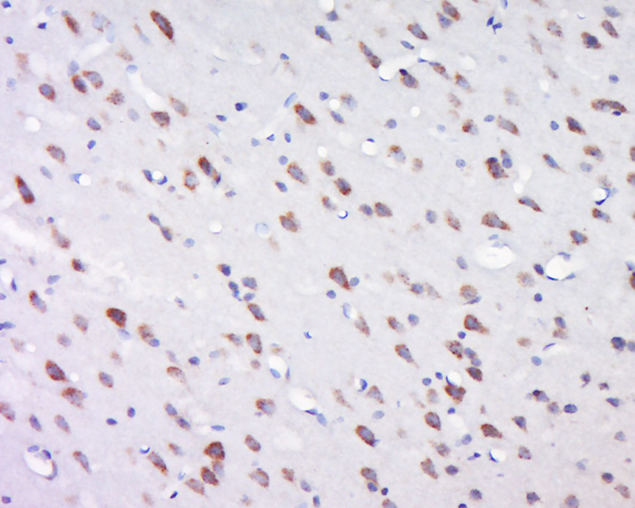 Paraformaldehyde-fixed, paraffin embedded (Rat brain); Antigen retrieval by boiling in sodium citrate buffer (pH6.0) for 15min; Block endogenous peroxidase by 3% hydrogen peroxide for 20 minutes; Blocking buffer (normal goat serum) at 37°C for 30min; Antibody incubation with (INT11/CPSF3L) Polyclonal Antibody, Unconjugated (bs-16677R) at 1:400 overnight at 4°C, followed by operating according to SP Kit(Rabbit) (sp-0023) instructionsand DAB staining.